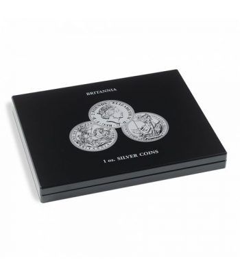 Estuche de color negro de alta calidad para albergar 20 monedas de plata Britannia (1 oz.) en cápsulas de LEUCHTTURM (CAPS 39 / CAPS 40). 1 bandeja con superficie aterciopelada y 20 divisiones redondas (45 mm Ø). Con grabados en color plata en la tapa y en su parte interior con motivo de las monedas. Interior de la tapa acolchado con raso negro. Seguro y discreto cierre magnético. Tamaño exterior: 305 x 30 x 245 mm. Las cápsulas no están incluidas. Ref. 360891