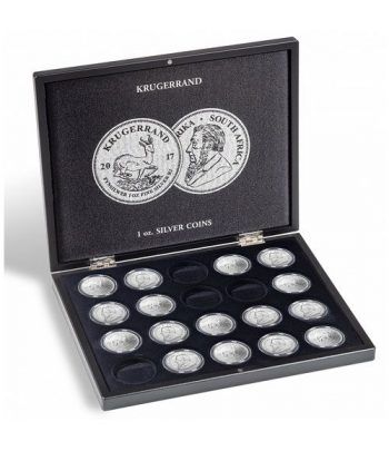 Estuche de color negro de alta calidad para albergar 20 monedas de plata Krugerrand (1 oz.) en cápsulas de LEUCHTTURM (CAPS 39). 1 bandeja con superficie aterciopelada y 20 divisiones redondas (45 mm Ø). Con grabados en color plata en la tapa y en su parte interior con motivo de las monedas. Interior de la tapa acolchado con raso negro. Seguro y discreto cierre magnético. Tamaño exterior: 305 x 30 x 245 mm. Las cápsulas no están incluidas. Ref. 361478