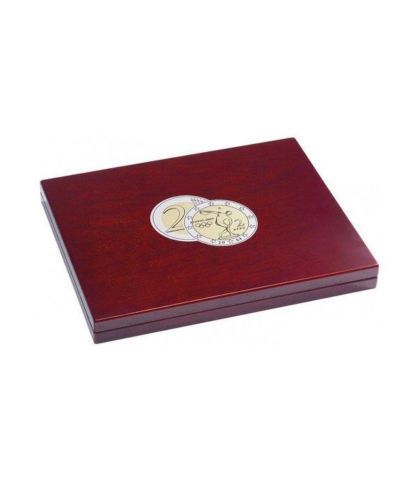 Estuche para monedas VOLTERRA UNO de Luxe, para 35 monedas de 2 Euros en cápsulas. Estuche de madera para monedas, color caoba y lujoso acabado. Tapa interior forrada con seda azul. Interior en terciopelo. Para moneda con capsula. No incluye las capsulas. Medida exterior: 305 x 245 x 30 mm. Ref. 323638