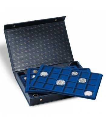 Estuche para monedas con 4 bandejas incluidas (para 128 monedas). Fabricado en polipiel de alta calidad, color azul oscuro, realizado según las técnicas tradicionales de encuadernación. Tapa grabada con bonito motivo. Cierre frontal mediante 2 botones automáticos de latón. Medidas exteriores: ancho 355 x largo 250 x alto 50 mm. Incluye: 2 Bandejas (azul) para 24 monedas cada una hasta 45 mm y 2 Bandejas (azul) para 40 monedas cada una hasta 33 mm. Ref. 330921