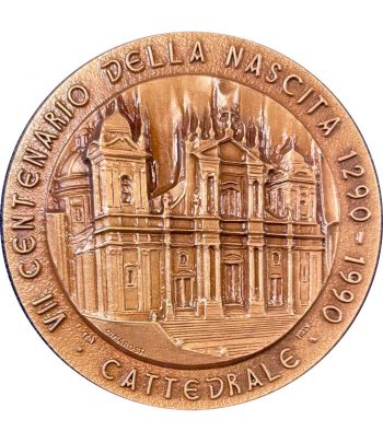 Medalla acuñada en 1990, con motivo de los 700 años del Nacimiento de San Conrado 1290-1990, patrón de la Ciudad y Diocesis de Noto, en Sicilia. Composición: Bronce. Diámetro: 50 mm.