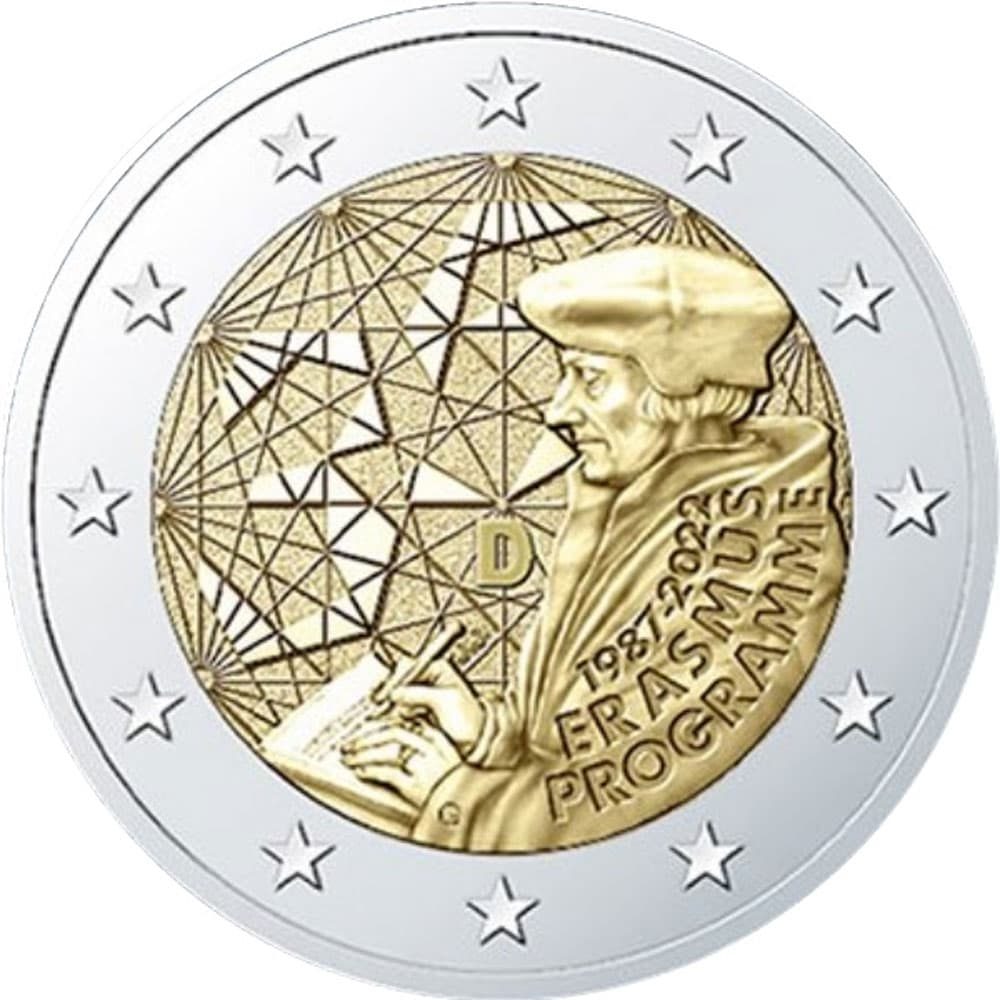 En la moneda el retrato de Erasmo de Róterdam sobre un haz de enlaces que atraviesa el fondo central de la moneda formando el número 35. Sobre la imagen de Erasmo se encuentran las leyendas 1987–2022, ERASMUS PROGRAMME.