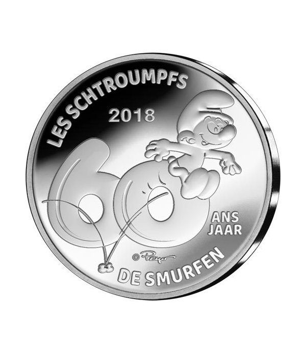 Moneda conmemorativa del 60 Aniversario de la Serie "Los Pitufos". Peso 14,60 gr. Plata 925. Diámetro: 30 mm. Tirada limitada: 6.250 unidades. Moneda encapsulada, en estuche original de color azul, con certificado.