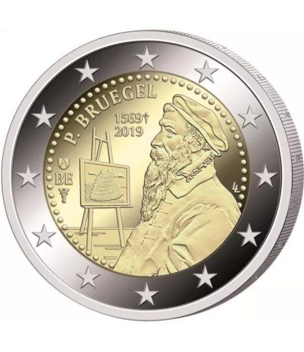 Moneda dedicada al 450º aniversario de la muerte de Pieter Brueghel el Viejo. El diseño muestra en la parte interior de la moneda el retrato del célebre artista belga Pieter Brueghel el Viejo, junto con uno de sus cuadros más famosos, La Torre de Babel, situado sobre un caballete. En la parte superior, se encuentra el nombre de P. Bruegel, el año 1569, con un pequeño obelisco que hace referencia al año de la muerte, y el año 2019, que es el de emisión.