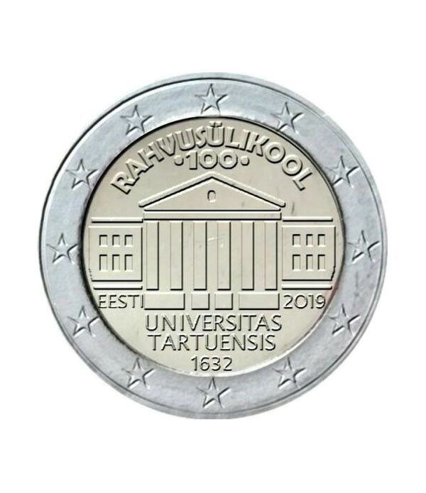 Moneda dedicada al Centenario de la fundación de la Universidad de Tartu como Universidad Nacional de Estonia. El diseño de la moneda tiene como motivo principal la fachada del edificio de la universidad y leyendas alusivas a la creación de esta en 1632, cuando fue fundada como Universidad de Tartu, y al Centenario que celebra en 2019 desde que se convirtió en Universidad Nacional de Estonia.